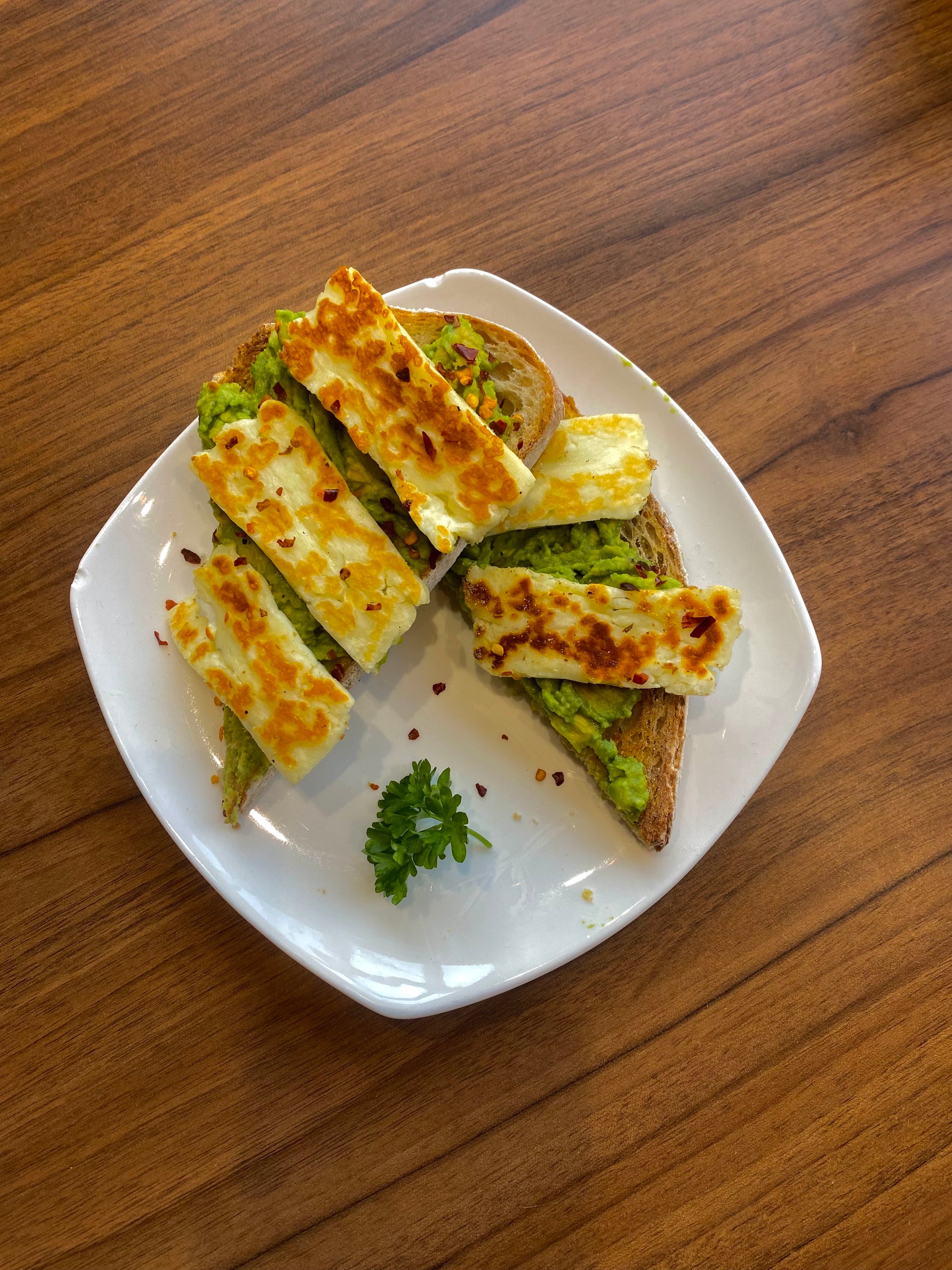Smashed Avocado on Sourdough Toast, topped with Tomato slices, Fried Halloumi and Chilli Flakes